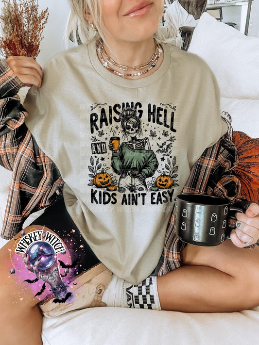 Raising Hell and Kids Ain’t Easy skeleton mom funny Vintage halloween T Shirt, spooky Graphic Tee, Spooky Humor Shirt, retro Aesthetic Top