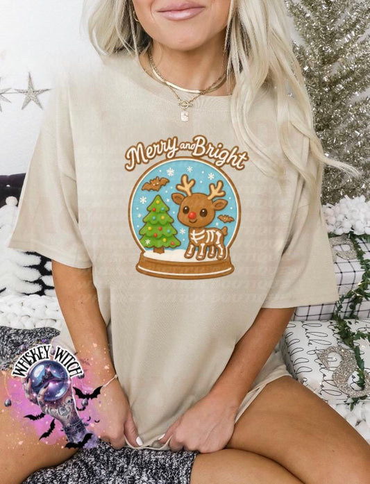 Merry and Bright Christmas Sweatshirt – Cute Reindeer Snow-Globe, Gingerbread Style Art, Cozy Unisex Holiday Graphic Tee